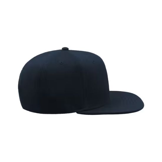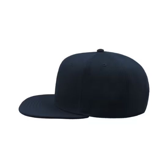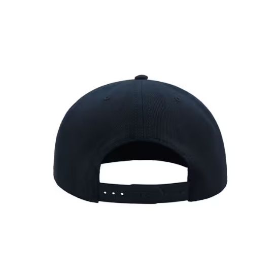 Casquette à six panneaux. Forme haute. Visière plate. Bouton pression en PVC pour la fermeture.