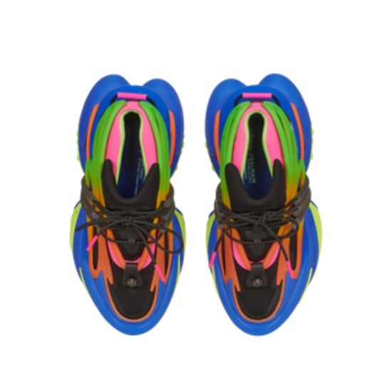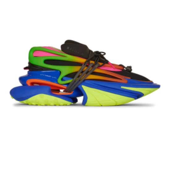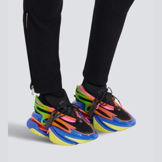 Baskets basses Unicorn en néoprène Lacets noirs sur le dessus, semelles compensées épaisses, zone ajourée avec contour sur la semelle et bouton pression tête de lion sur le dessus. Taille: 40,41,42,43,44 et 45