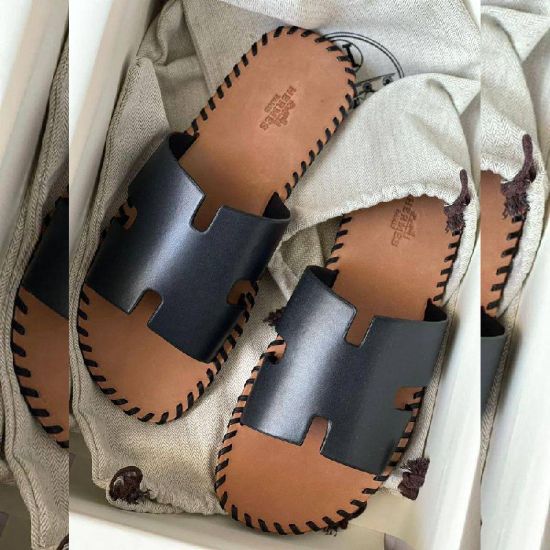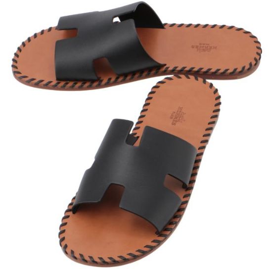 Modèle sandale Izmir Hermès. Sandale en cuir de veau avec découpe emblématique en "H" et détail à bords francsModèle iconique d'Hermès. Taille 40,41,42,43,44,45 et 46