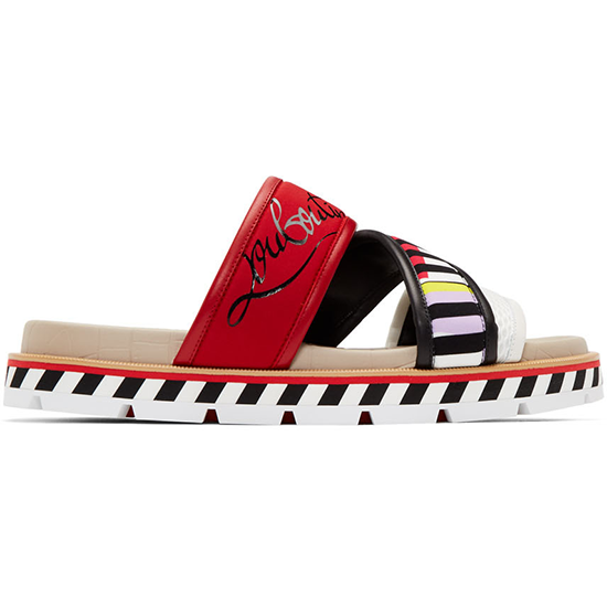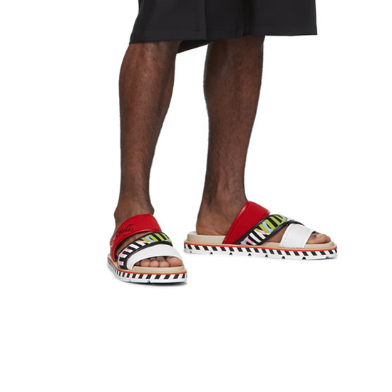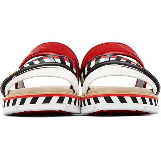 Sandales en filet et jersey multicolores. Garniture en cuir rouge, noire et blanche sur l'ensemble. Bout rond ouvert. Logo noir imprimé sur le côté extérieur. Taille: 40,41,42,43,44 et 45