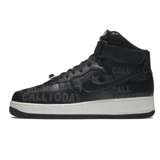 La Nike Air Force 1 High Toll Free présente une empeigne en cuir noir, complétée par des inscriptions réfléchissantes « Call Today » et « Toll Free ». Une autre inscription « 1-800 » est présente sur la languette et la cheville, en référence