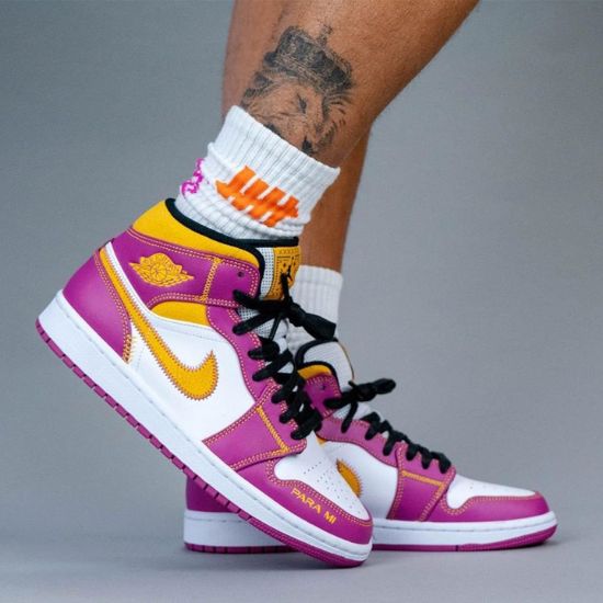 La AJ1 de la collection Day of the Dead 2020 présente une combinaison de violet et de jaune. Ces couleurs représentent les fleurs faisant partie des offrandes. Taille: 40,41,42,43,44 et 45