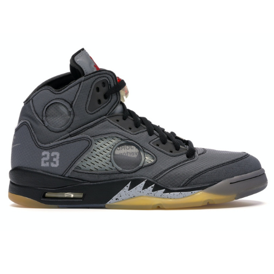 La Air JD 5 Retro Off White adopte un style assez détaillé, avec un upper gris en tpu. Du côté des lacets, noirs, on note l’inscription « SHOELACES », signature Off-White. Taille: 40,41,42,43,44 et 45