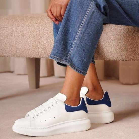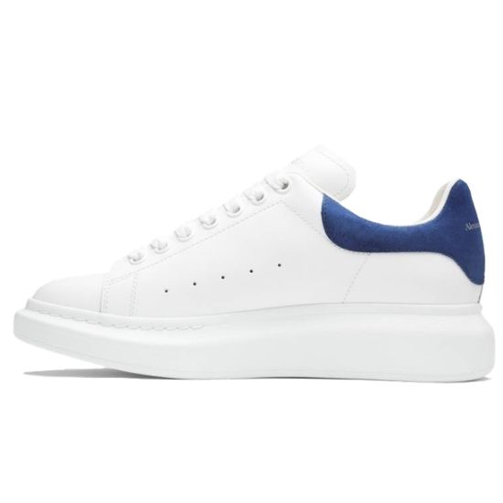 Baskets en cuir blanches Alexander McQueen. Les baskets ont un bout arrondi et un talon en daim bleu Paris, de grands lacets plats et un logo Alexander McQueen. Taille: 38,39,40,41,42,43,44 et 45