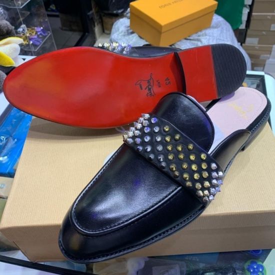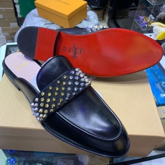 Fabriquées en Italie dans du cuir noir lisse, ces mules signées Christian Louboutin possèdent un bout en forme d'amande et sont ornées de clous dorés sur la tige. Taille: 41,42,43,44 et 45