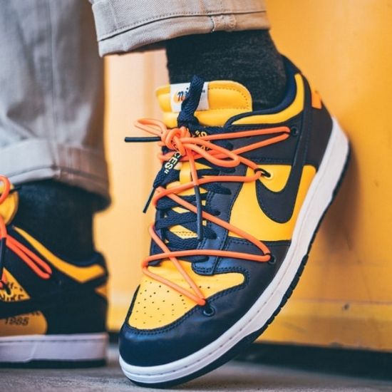 La Nike Dunk Low Off-White Michigan est composée d’un upper mélangeant des empiècements de cuir jaune et bleu marine. Taille: 40,41,42,43,44 et 45